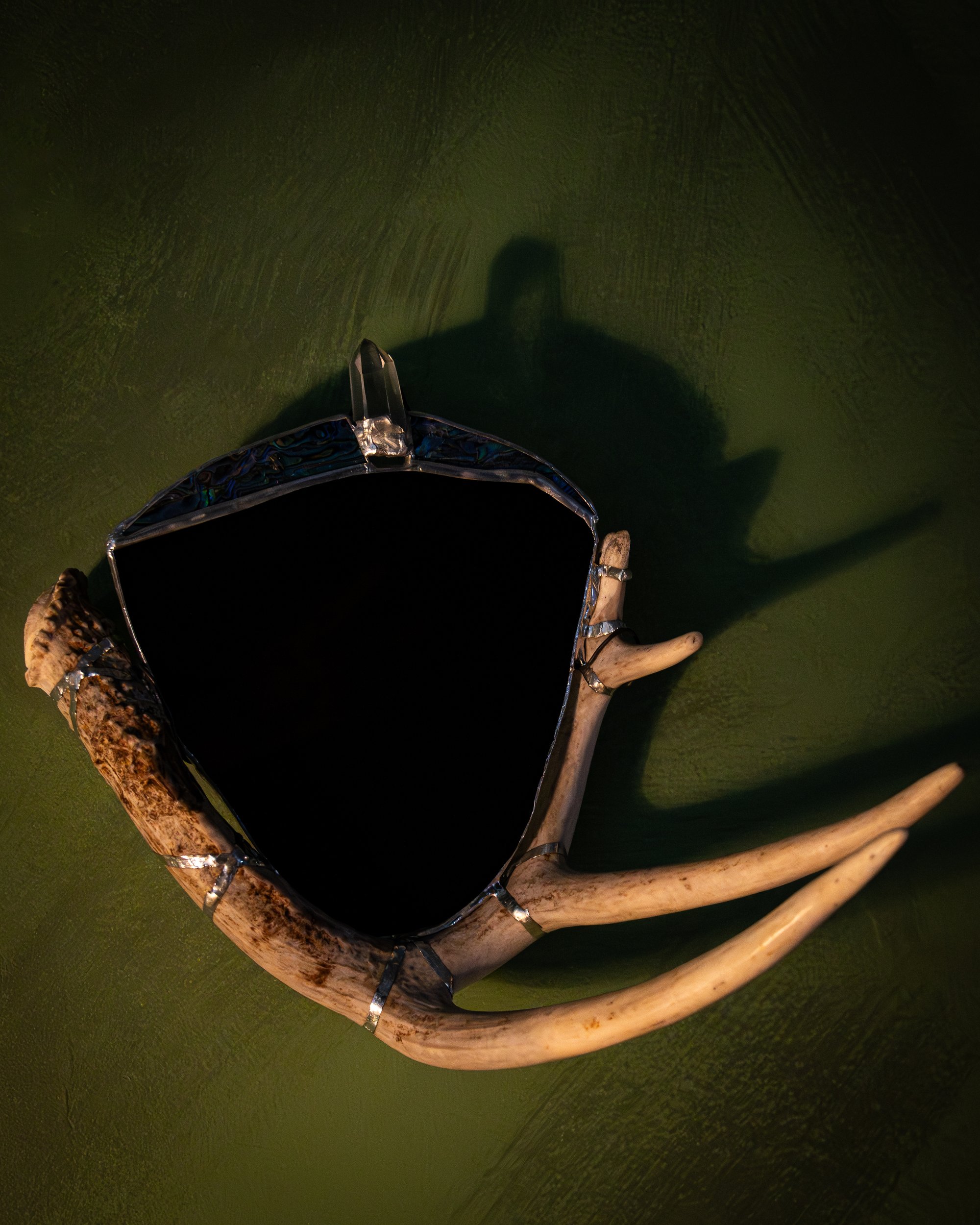 scavenged antler cradling a double sided scrying mirrora crescent of abalone crowns the topin its center, a quartz point emergesmeasurements:
